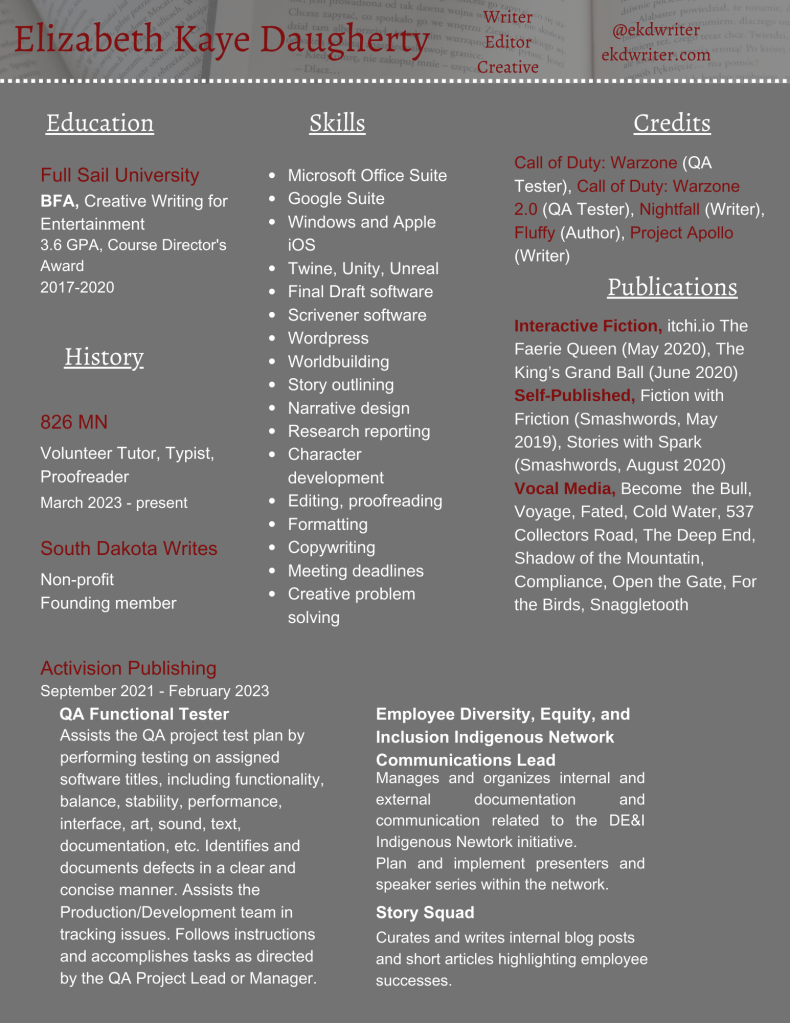 I chose to attend Full Sail University because a friend told me that they taught all kinds of writing, not just traditional literature writing. I always knew I wanted to be a writer, and had written my first story when I was in first grade about the Easter Bunny. Full Sail provided the chance to learn from industry professionals who had already succeeded in doing some of the things I wanted to do, and their advice was invaluable. They harbored my love of writing and encouraged me to let it grow and showed me how to make it stronger. I found a love of creative non-fiction writing, which branched into many new interests within the medium of literature. Where writing and publishing once seemed like a one in a million chance, it now seemed possible to write and do anything I wanted as long as I put in the effort. Graduating in 2020, at the height of the Covid-19 pandemic did make getting a job immediately after graduation difficult, but I never lost the drive.